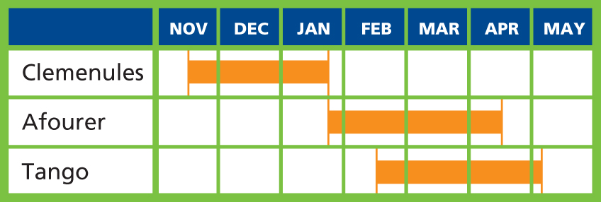 practices and fruit quality. Safe & traceable, all season longClem 'N Tina's are available November through April, and throughout the season are 100% traceable back to the orchard. That's because SunWest Fruit Company is an SQF Certified operation – the highest food safety certification standard. Varieties and Harvest Dates![]() |