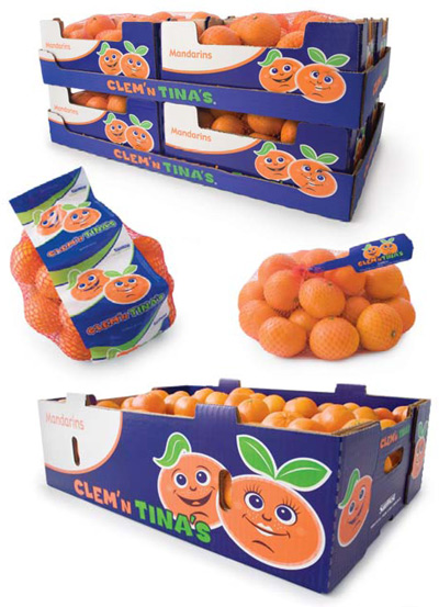 Packaged to please.With the beaming faces of "Clem" and "Tina" on every package, these delightful fruits are being promoted in a way that enhances their fun, playful, family-friendly image. Add the fact that the Clem 'N Tina's brand name is a registered trademark of SunWest Fruit Company, and it's easy to see the seamless, season-long branding of the uniquely profitable Clementine/Mandarin category. Clem 'N Tina's are available in the popular 5 lb. bag-in-a-box, as well as 2 lb., 3 lb. and 5 lb. display bags and 2 lb., 3 lb. and 5 lb. value bags. Bulk product is also available. |